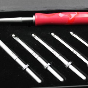 A beautiful unique one of a kind hand turned acrylic handle. Has 6 interchangeable hook sizes (C/2, D/3, E/4, F/5, G/6, H/8 )  Has a box to hold all hooks and handle. FREE Shipping !