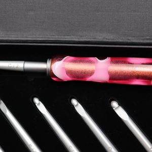 A beautiful unique one of a kind hand turned acrylic handle. Has 6 interchangeable hook sizes (C/2, D/3, E/4, F/5, G/6, H/8 )  Has a box to hold all hooks and handle. FREE Shipping !