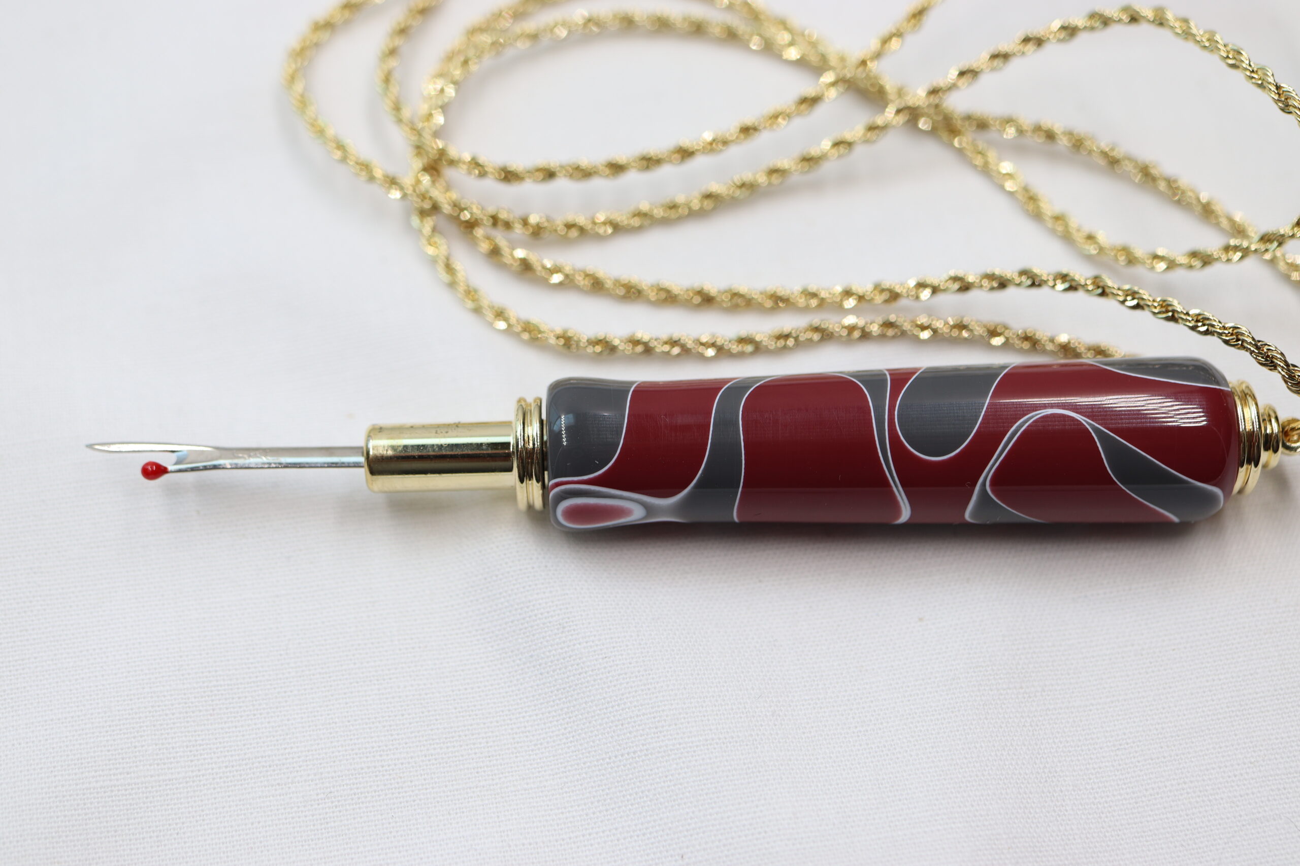 Our seam ripper necklace makes taking out a seam a quick and easy task. This handy and stylish magnetic necklace is reversible so you can safely use and store it after use. The necklace features a super strong magnet quick-release clasp that conveniently releases and reattaches. Included is a 36” long chain. Each seam ripper is super sharp and is a unique hand-turned, one-of-a-kind item.  FREE SHIPPING!