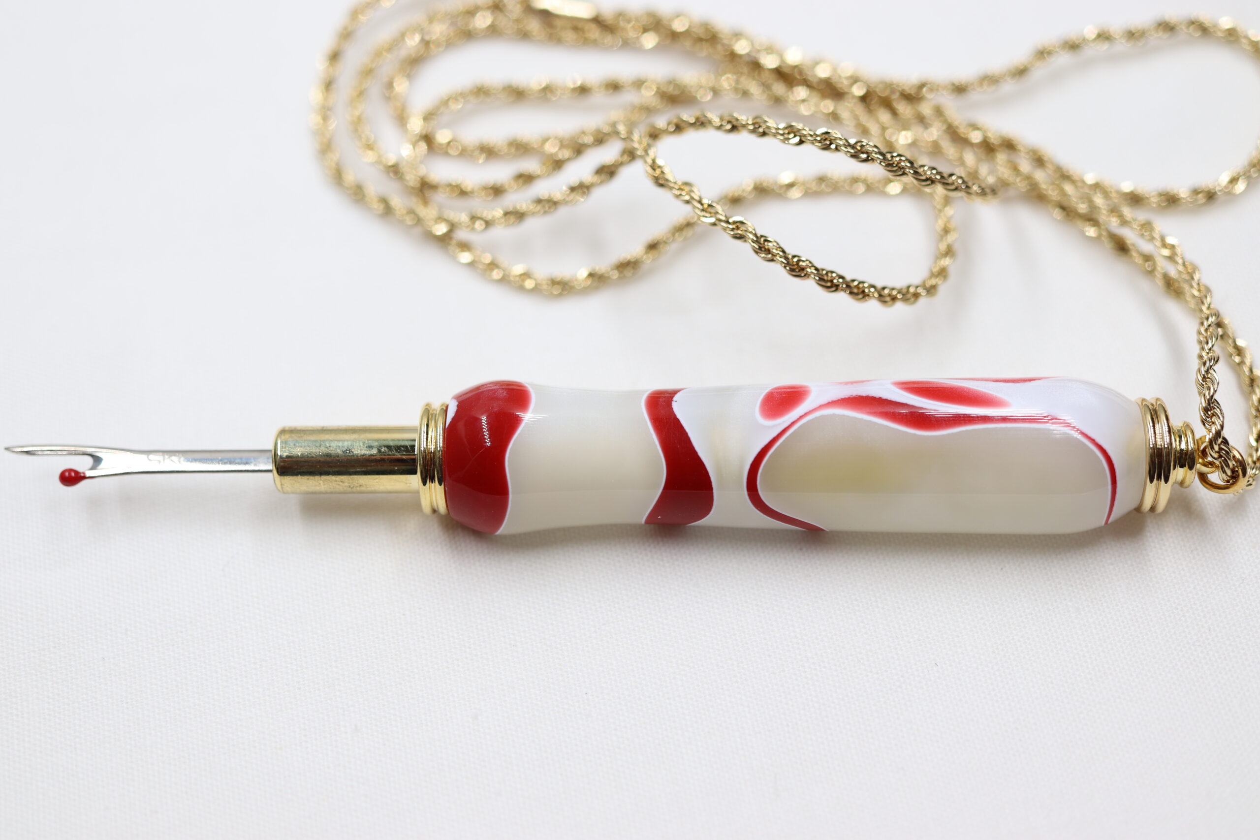 Our seam ripper necklace makes taking out a seam a quick and easy task. This handy and stylish magnetic necklace is reversible so you can safely use and store it after use. The necklace features a super strong magnet quick-release clasp that conveniently releases and reattaches. Included is a 36” long chain. Each seam ripper is super sharp and is a unique hand-turned, one-of-a-kind item.  FREE SHIPPING!