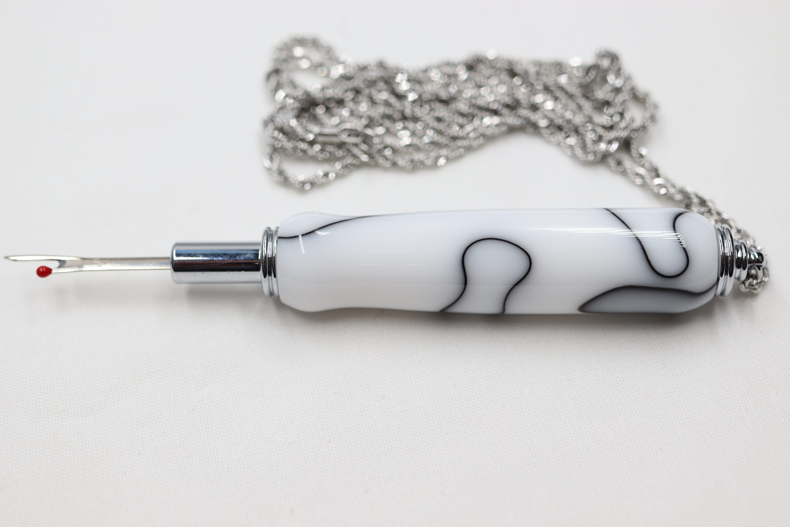 Our seam ripper necklace makes taking out a seam a quick and easy task. This handy and stylish magnetic necklace is reversible so you can safely use and store it after use. The necklace features a super strong magnet quick-release clasp that conveniently releases and reattaches. Included is a 36” long chain. Each seam ripper is super sharp and is a unique hand-turned, one-of-a-kind item.  FREE SHIPPING!